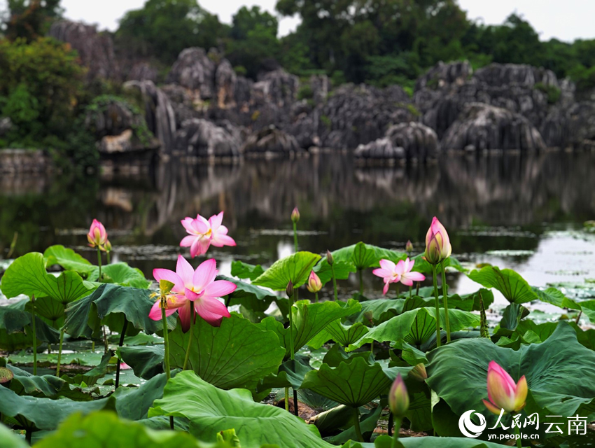 Photo shows a beautiful view of blooming lotus flowers after the rain in the Stone Forest Scenic Area in Kunming, southwest China's Yunnan Province. (People's Daily Online/Yin Xin)
