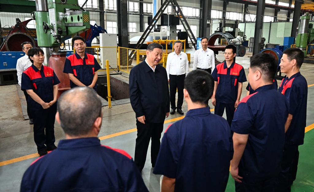 YANGQUAN, Shanxi, July 7 (Xinhua) -- Xi Jinping, general secretary of the Communist Party of China Central Committee, on Monday afternoon inspected a valve manufacturing company in Yangquan City, north China's Shanxi Province, where he learned about the province's efforts to promote the transformation and upgrade of industries and high-quality development.