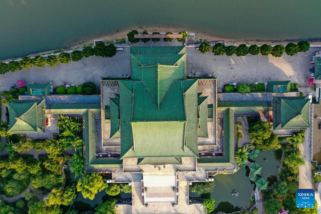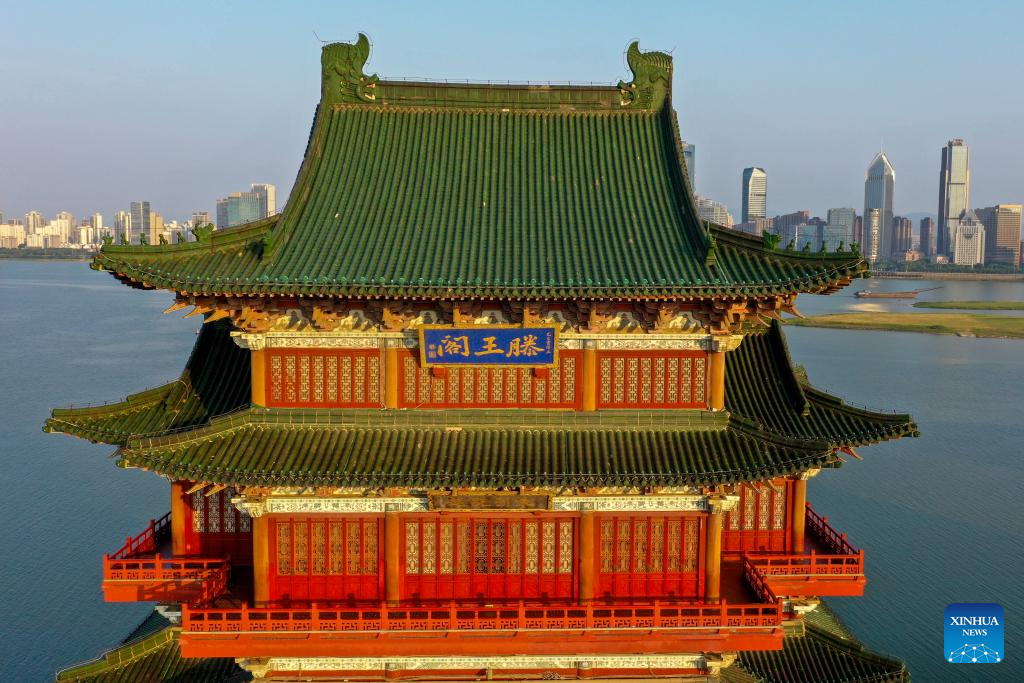 An aerial drone photo taken on July 7, 2025 shows a view of the Tengwang Pavilion scenic area in the morning light in Nanchang City, east China's Jiangxi Province. The Tengwang Pavilion, the 29th iteration in its 1,400-year history, features intricately carved beams and vibrantly painted rafters. It stands majestically along the banks of the Ganjiang River, which winds through eastern China's Jiangxi Province. About 90 percent of the scenic area has been open to the public for free as of Jan. 1 this year when a northward expansion project was fully completed. (Xinhua/Liu Jinhai)