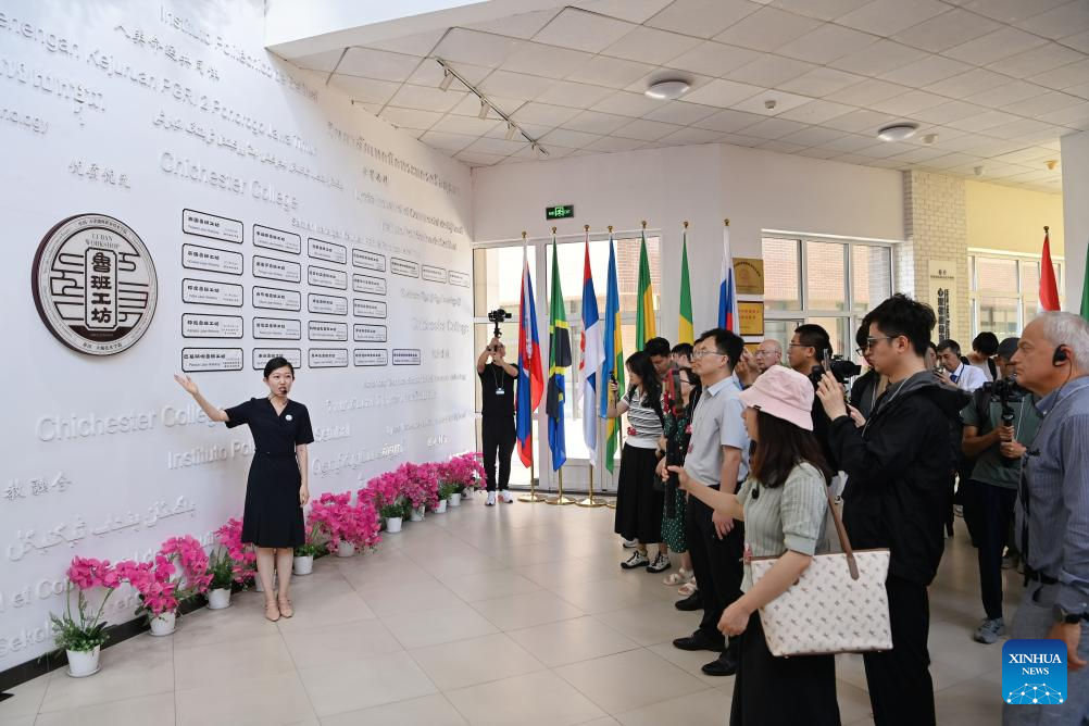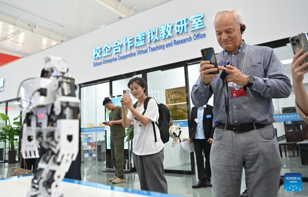 Guests visit Tianjin Light Industry Vocational Technical College in north China's Tianjin, July 7, 2025. Guests gathered in Tianjin for the Global Mayors Dialogue -- SCO Summit Cities and visited the smart zero-carbon terminal of Tianjin Port, Luban Workshop Construction and Experience Museum and other places to learn about China's economic and social development. (Xinhua/Li Ran)