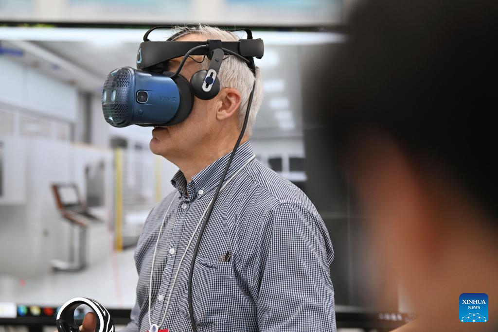 A guest experiences a VR device at Tianjin Light Industry Vocational Technical College in north China's Tianjin, July 7, 2025. Guests gathered in Tianjin for the Global Mayors Dialogue -- SCO Summit Cities and visited the smart zero-carbon terminal of Tianjin Port, Luban Workshop Construction and Experience Museum and other places to learn about China's economic and social development. (Xinhua/Li Ran)