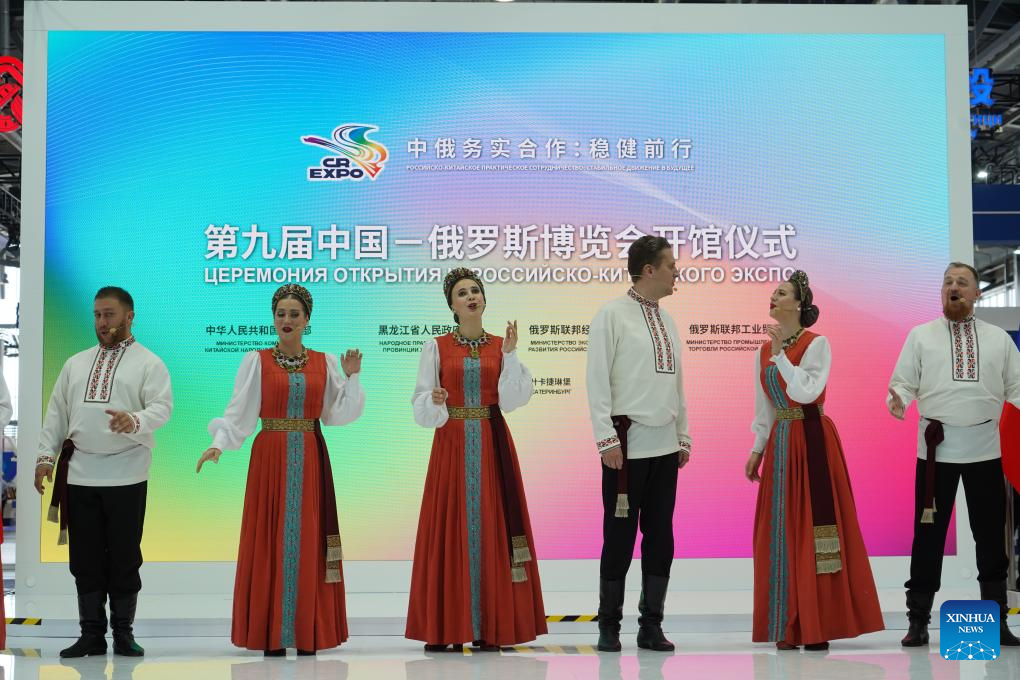Russian artists perform at the ninth China-Russia Expo in Yekaterinburg, Russia, July 7, 2025. Chinese enterprises showcase products in sectors such as electromechanical equipment, agriculture, health care, the digital economy and new energy at the event. (Xinhua/Liu Kai)