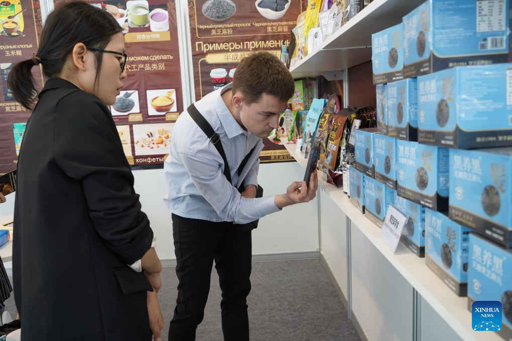 A visitor learns about Chinese agricultural products at the ninth China-Russia Expo in Yekaterinburg, Russia, July 7, 2025. Chinese enterprises showcase products in sectors such as electromechanical equipment, agriculture, health care, the digital economy and new energy at the event. (Xinhua/Liu Kai)