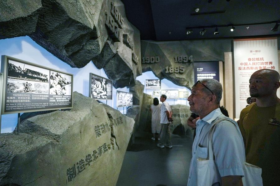 People visit an exhibition themed "For National Liberation and World Peace" at the Museum of the War of Chinese People's Resistance Against Japanese Aggression in Beijing, capital of China, July 8, 2025. (Xinhua/Zhang Chenlin)