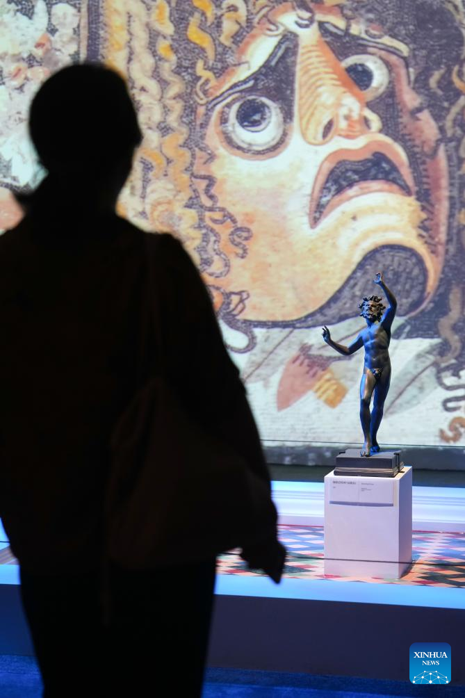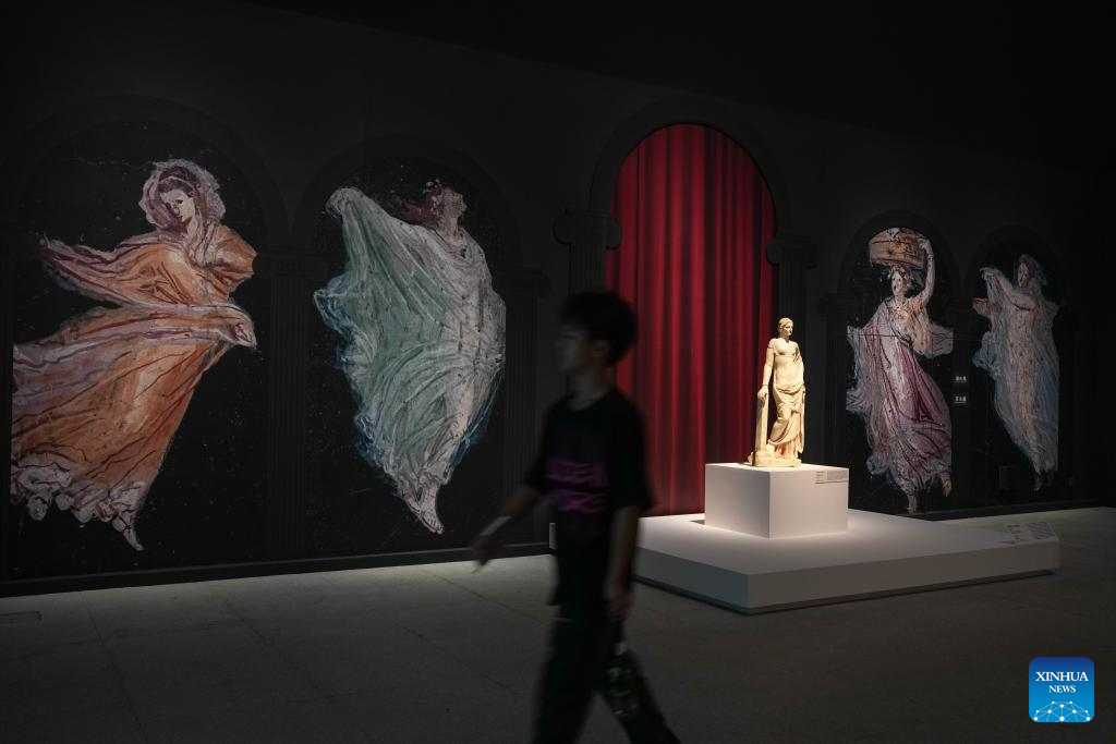 This photo shows an exhibit at the exhibition "Meet Pompeii: The Eternal City" at the Hunan Museum in Changsha, capital of central China's Hunan Province, July 8, 2025. This exhibition showcasing cultural relics from ancient Pompeii opened here on Tuesday. It features more than 130 artifacts, including frescoes, sculptures, and bronze and gold ware, and will run through November 2 this year. Pompeii, situated between Naples and the Amalfi Coast, is a UNESCO World Heritage Site. The ancient city was buried under volcanic ash and pumice during the catastrophic eruption of Mount Vesuvius in the year 79. (Xinhua/Xue Yuge)