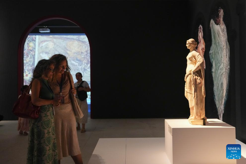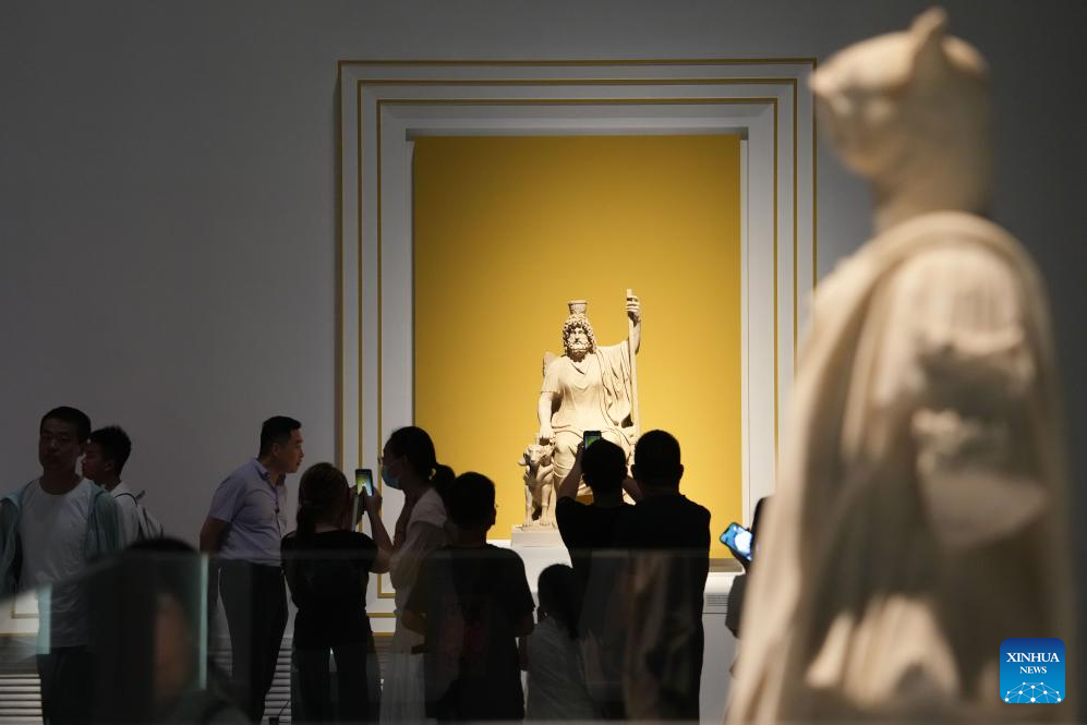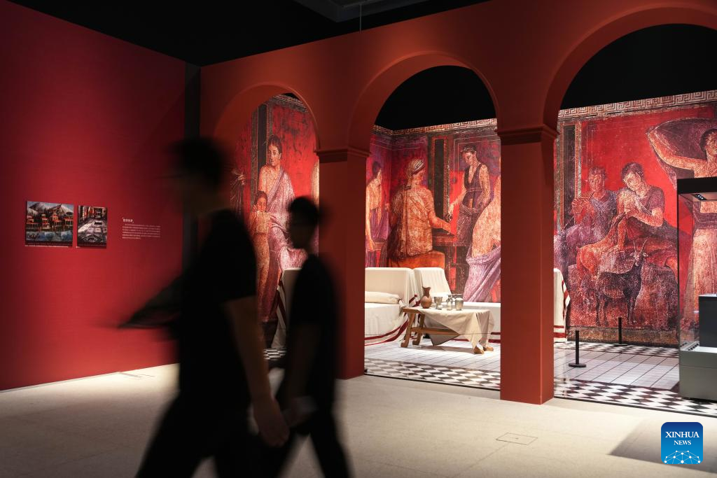 People visit the exhibition "Meet Pompeii: The Eternal City" at the Hunan Museum in Changsha, capital of central China's Hunan Province, July 8, 2025. This exhibition showcasing cultural relics from ancient Pompeii opened here on Tuesday. It features more than 130 artifacts, including frescoes, sculptures, and bronze and gold ware, and will run through November 2 this year. Pompeii, situated between Naples and the Amalfi Coast, is a UNESCO World Heritage Site. The ancient city was buried under volcanic ash and pumice during the catastrophic eruption of Mount Vesuvius in the year 79. (Xinhua/Xue Yuge)