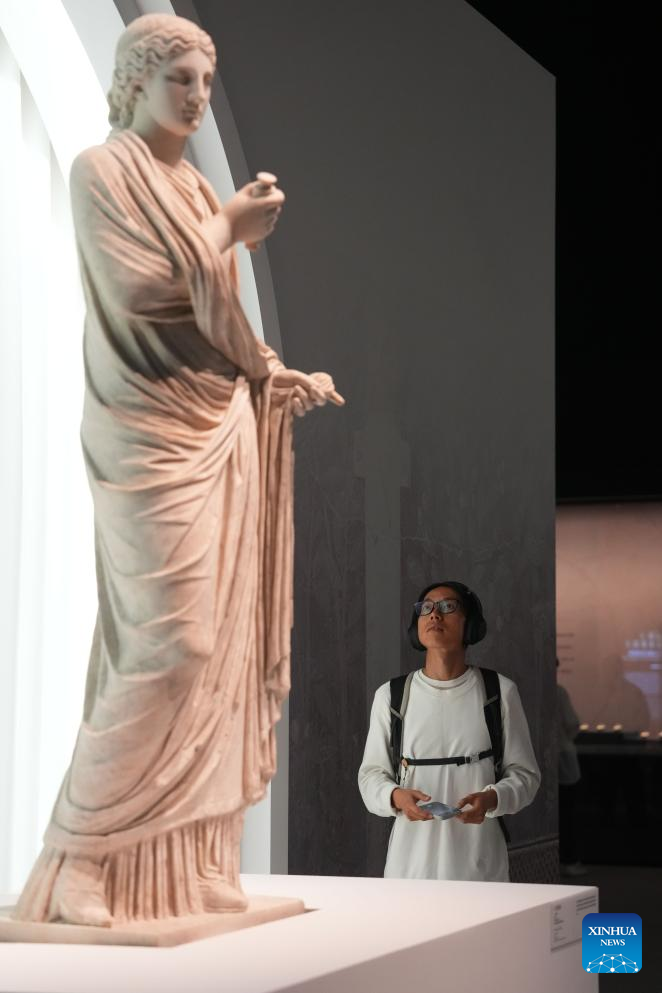 A visitor visits the exhibition "Meet Pompeii: The Eternal City" at the Hunan Museum in Changsha, capital of central China's Hunan Province, July 8, 2025. This exhibition showcasing cultural relics from ancient Pompeii opened here on Tuesday. It features more than 130 artifacts, including frescoes, sculptures, and bronze and gold ware, and will run through November 2 this year. Pompeii, situated between Naples and the Amalfi Coast, is a UNESCO World Heritage Site. The ancient city was buried under volcanic ash and pumice during the catastrophic eruption of Mount Vesuvius in the year 79. (Xinhua/Xue Yuge)