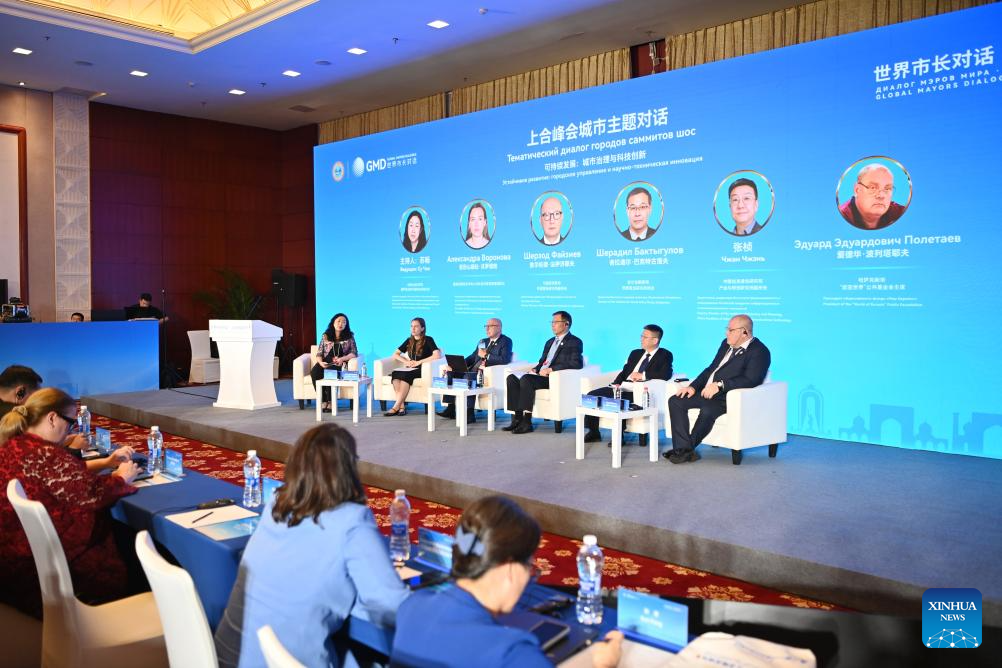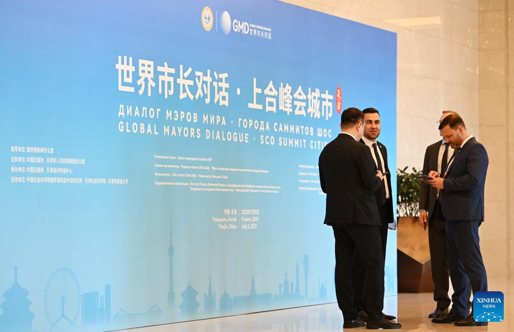 Guests speak at a panel discussion during the Global Mayors Dialogue -- SCO Summit Cities in north China's Tianjin Municipality, July 8, 2025. The dialogue opened here on Tuesday. Guests including mayors, diplomatic envoys and experts from different countries were brought under the same roof to share their opinions on how Shanghai Cooperation Organization (SCO) member countries can further deepen practical cooperation in fields such as interconnection, trade and investment, green development, and people-to-people exchanges. (Xinhua/Li Ran)