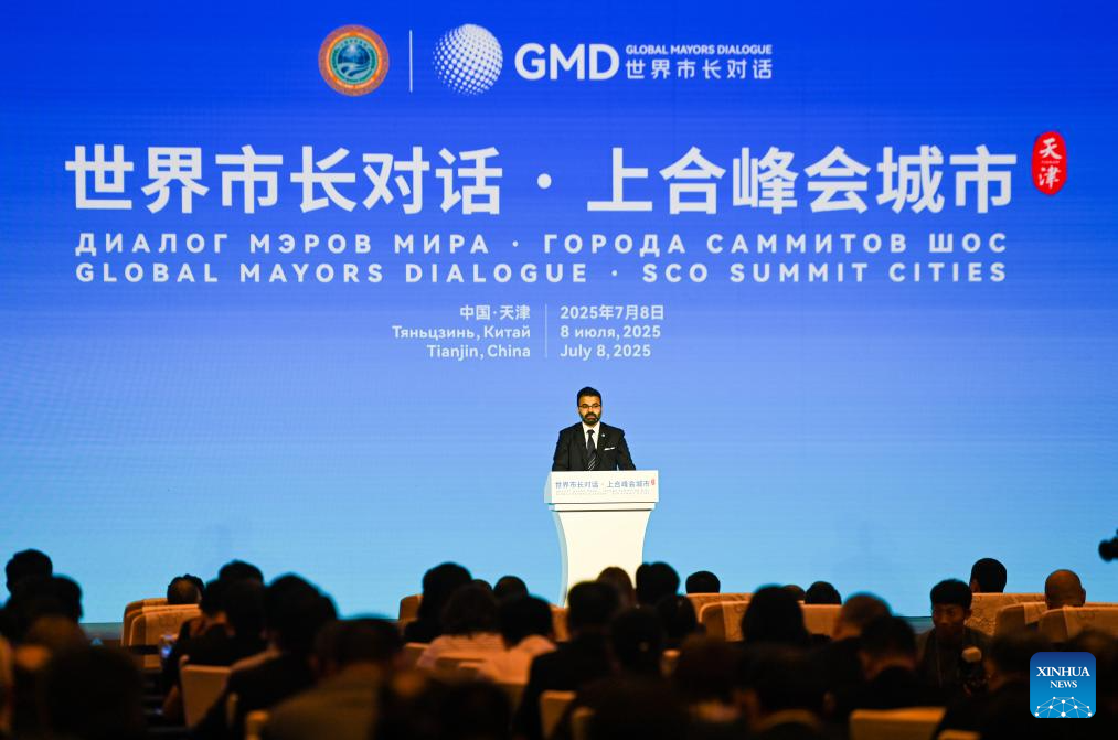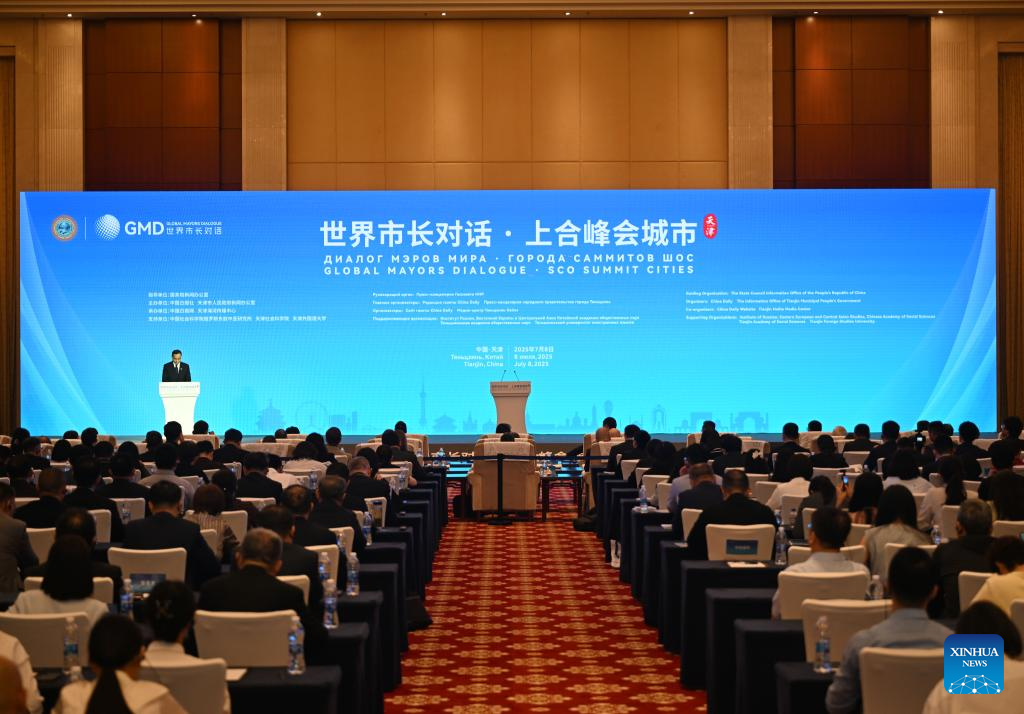 This photo taken on July 8, 2025 shows the opening ceremony of the Global Mayors Dialogue -- SCO Summit Cities in north China's Tianjin Municipality. The dialogue opened here on Tuesday. Guests including mayors, diplomatic envoys and experts from different countries were brought under the same roof to share their opinions on how Shanghai Cooperation Organization (SCO) member countries can further deepen practical cooperation in fields such as interconnection, trade and investment, green development, and people-to-people exchanges. (Xinhua/Zhao Zishuo)