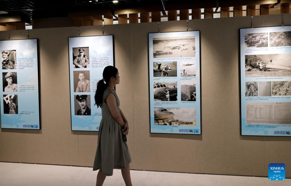 A visitor views exhibits at the Flying Tigers Photo Exhibition in Shanghai, east China, July 8, 2025. Themed "Remembering heroes and creating the future together," the exhibition opened here on Tuesday, showcasing hundreds of valuable photos as well as other items of historic significance contributed by veterans of the Flying Tigers. (Xinhua/Fang Zhe)