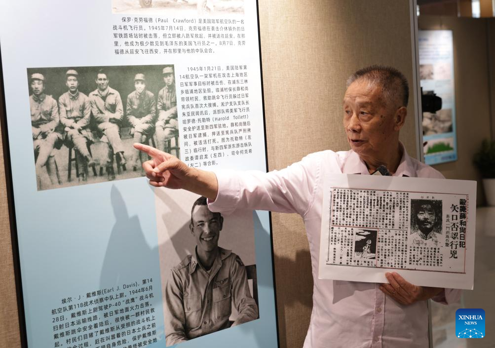 A descendant of a Shanghai native who was killed by Japanese invaders for rescuing distressed members of the Flying Tigers recounts the story of his ancester at the Flying Tigers Photo Exhibition in Shanghai, east China, July 8, 2025. Themed "Remembering heroes and creating the future together," the exhibition opened here on Tuesday, showcasing hundreds of valuable photos as well as other items of historic significance contributed by veterans of the Flying Tigers. (Xinhua/Fang Zhe)