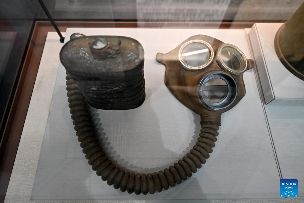 This photo taken on July 7, 2025 shows a gas mask used by Japanese invaders at the memorial hall commemorating the Hundred-Regiment Campaign in Yangquan, north China's Shanxi Province. The Hundred-Regiment Campaign took place in northern China from August 1940 to January 1941 during the Chinese People's War of Resistance Against Japanese Aggression. (Xinhua/Zhan Yan)