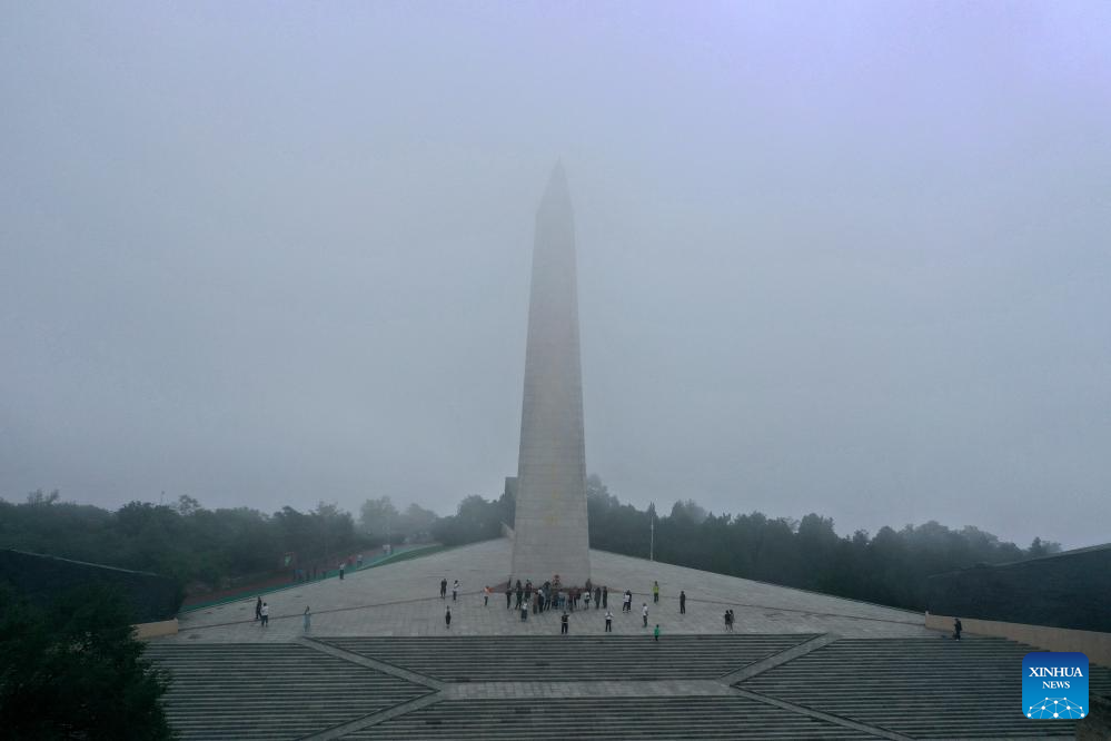 A drone photo taken on July 8, 2025 shows a monument to the Hundred-Regiment Campaign in Yangquan, north China's Shanxi Province. The Hundred-Regiment Campaign took place in northern China from August 1940 to January 1941 during the Chinese People's War of Resistance Against Japanese Aggression. (Xinhua/Zhan Yan)