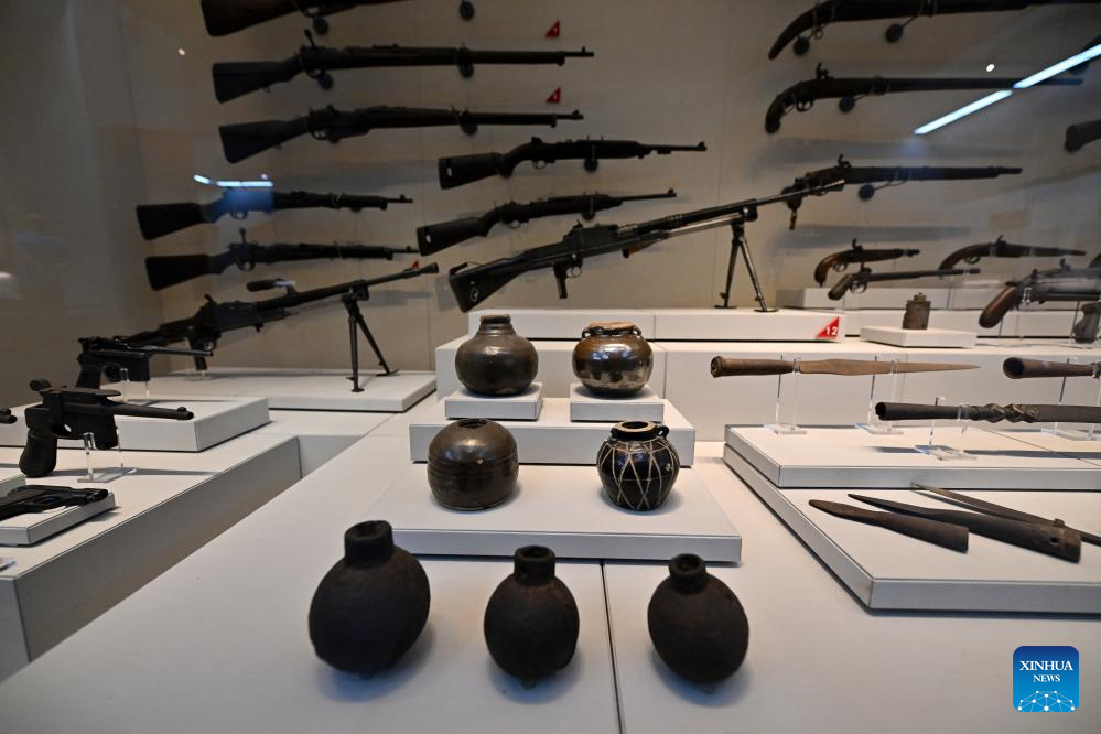 This photo taken on July 7, 2025 shows weapons used by Japanese invaders at the memorial hall commemorating the Hundred-Regiment Campaign in Yangquan, north China's Shanxi Province. The Hundred-Regiment Campaign took place in northern China from August 1940 to January 1941 during the Chinese People's War of Resistance Against Japanese Aggression. (Xinhua/Zhan Yan)