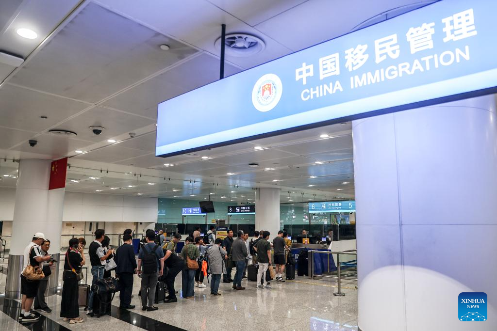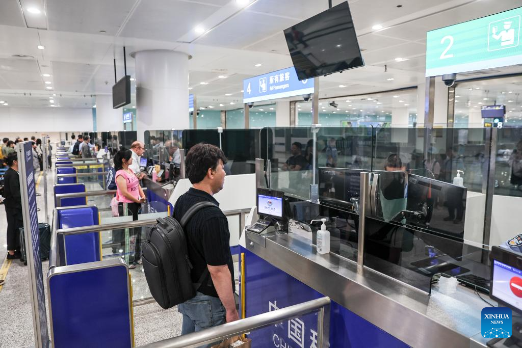 Passengers go through passport control at Zhoushuizi International Airport in Dalian, northeast China's Liaoning Province, July 9, 2025. Thanks to China's visa-free policies and related measures, the number of inbound travelers at Zhoushuizi International Airport has seen steady growth in the first half of 2025. The airport handled approximately 668,000 inbound and outbound passengers during this period, marking a 23.1 percent year-on-year increase. Among them, 89,000 were inbound foreign visitors, representing a 53.4 percent surge compared to the same period of the previous year. (Xinhua/Pan Yulong)