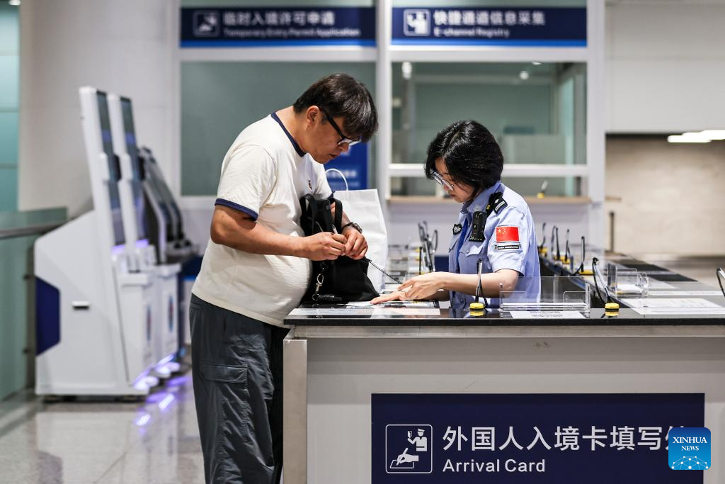 A police officer helps a South Korean passenger fill in arrival card at Zhoushuizi International Airport in Dalian, northeast China's Liaoning Province, July 9, 2025. Thanks to China's visa-free policies and related measures, the number of inbound travelers at Zhoushuizi International Airport has seen steady growth in the first half of 2025. The airport handled approximately 668,000 inbound and outbound passengers during this period, marking a 23.1 percent year-on-year increase. Among them, 89,000 were inbound foreign visitors, representing a 53.4 percent surge compared to the same period of the previous year. (Xinhua/Pan Yulong)