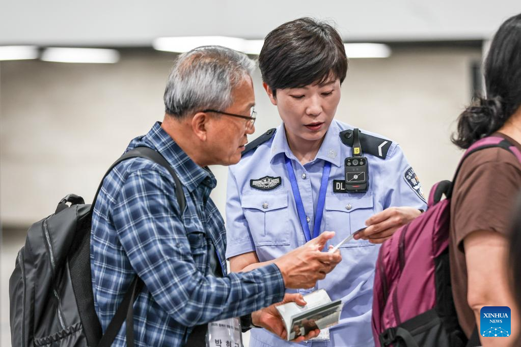 An auxiliary police officer helps a South Korean passenger with his questions at Zhoushuizi International Airport in Dalian, northeast China's Liaoning Province, July 9, 2025. Thanks to China's visa-free policies and related measures, the number of inbound travelers at Zhoushuizi International Airport has seen steady growth in the first half of 2025. The airport handled approximately 668,000 inbound and outbound passengers during this period, marking a 23.1 percent year-on-year increase. Among them, 89,000 were inbound foreign visitors, representing a 53.4 percent surge compared to the same period of the previous year. (Xinhua/Pan Yulong)