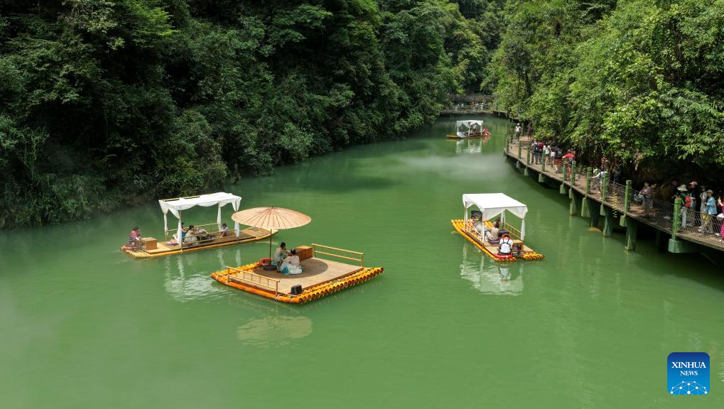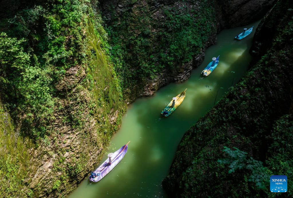 Tourists take boats enjoying the view of Pingshan canyon in Hefeng County, Enshi Tujia and Miao Autonomous Prefecture, central China's Hubei Province, July 9, 2025. The unique canyon landscape and limpid water make the Pingshan Canyon an attractive destination for tourists. (Xinhua/Wu Zhizun)