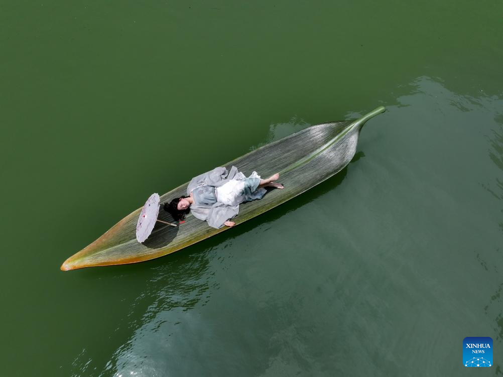An aerial drone photo taken on July 9, 2025 shows a tourist taking a boat at the Pingshan canyon in Hefeng County, Enshi Tujia and Miao Autonomous Prefecture, central China's Hubei Province. The unique canyon landscape and limpid water make the Pingshan Canyon an attractive destination for tourists. (Photo by Zhao Jun/Xinhua)