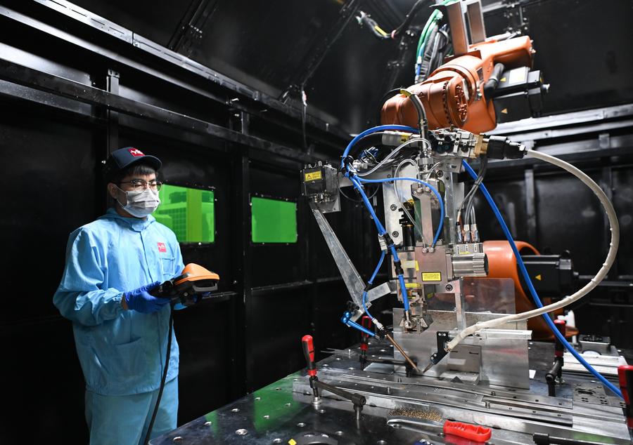 A staff member sets parameters before welding at Guangdong Lyric Robot Automation Co., Ltd. in Huizhou, south China's Guangdong Province, June 27, 2025. (Xinhua/Deng Hua)