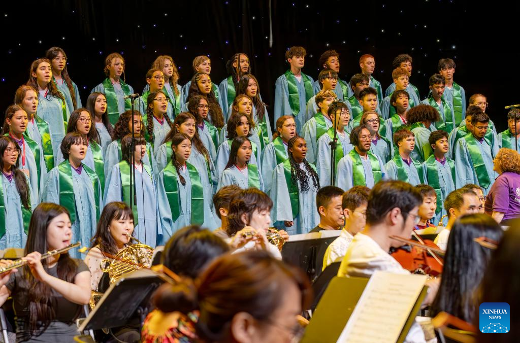 Youths from China and the United States sing during the opening ceremony of Bond with Kuliang: 2025 China-U.S. Youth Choir Festival, in Fuzhou, southeast China's Fujian Province, July 10, 2025. Bond with Kuliang: 2025 China-U.S. Youth Choir Festival, with the theme of "Singing for Peace", kicked off here on Thursday.