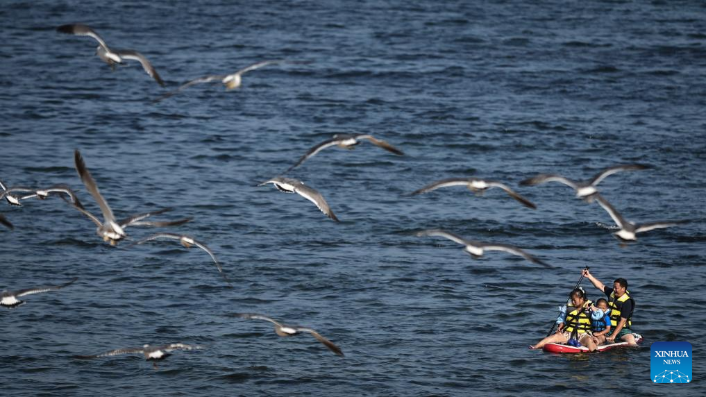 Tourists feed seagulls on the beach of Fujiazhuang Park in Dalian, northeast China's Liaoning Province on July 10, 2025. Dalian has been experiencing continuous high temperatures in recent days. The beach of Fujiazhuang Park in Dalian attracted a large number of tourists to cool off. (Xinhua/Pan Yulong)