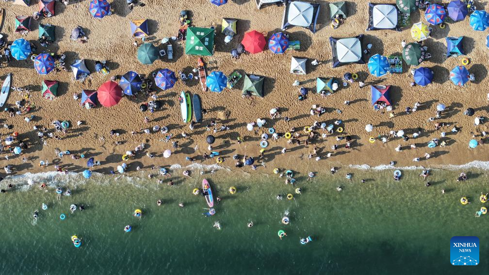 An aerial drone photo taken on July 10, 2025 shows a view of the beach of Fujiazhuang Park in Dalian, northeast China's Liaoning Province. Dalian has been experiencing continuous high temperatures in recent days. The beach of Fujiazhuang Park in Dalian attracted a large number of tourists to cool off. (Xinhua/Pan Yulong)