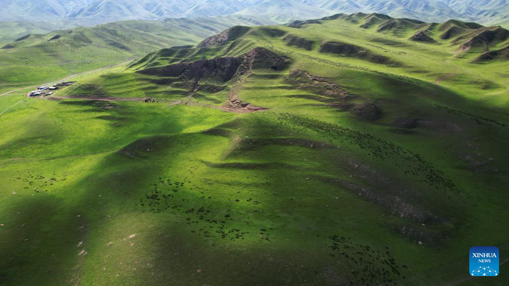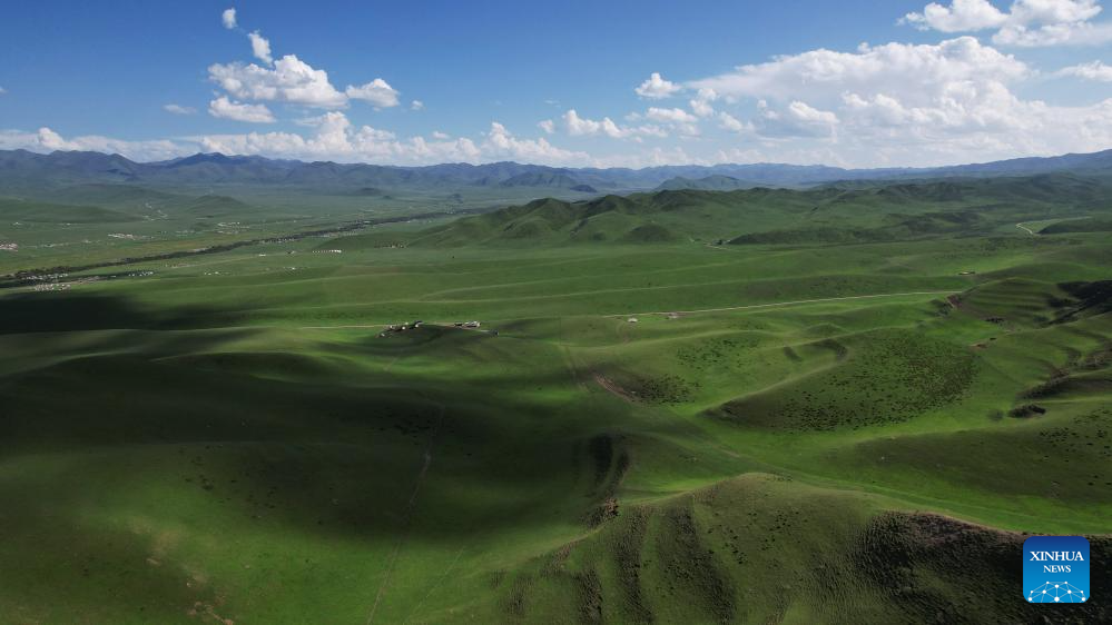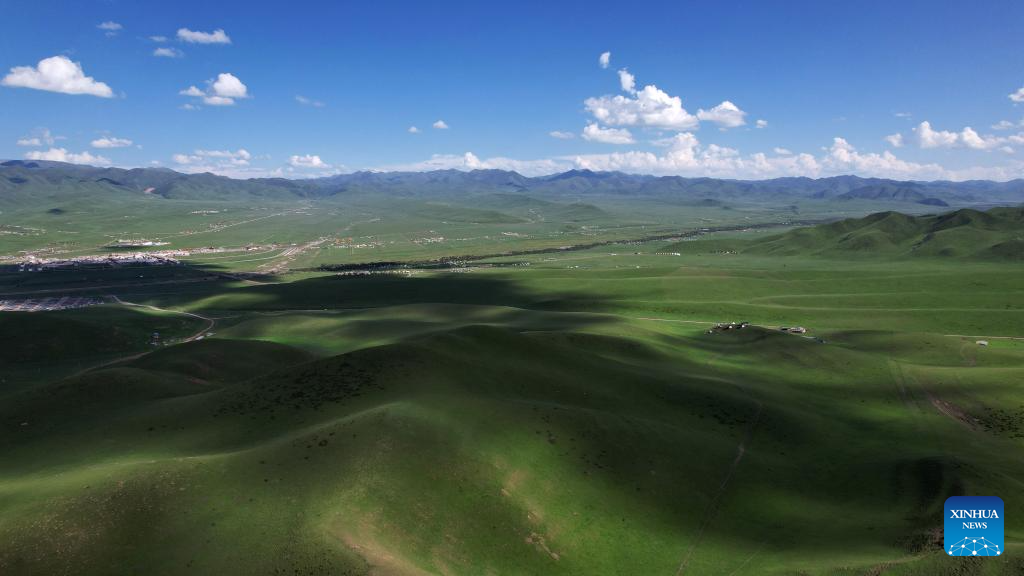 An aerial drone photo taken on July 10, 2025 shows the scenery of the Sangke Grassland in Xiahe County, Gannan Tibetan Autonomous Prefecture, northwest China's Gansu Province. (Xinhua/Ma Ning)