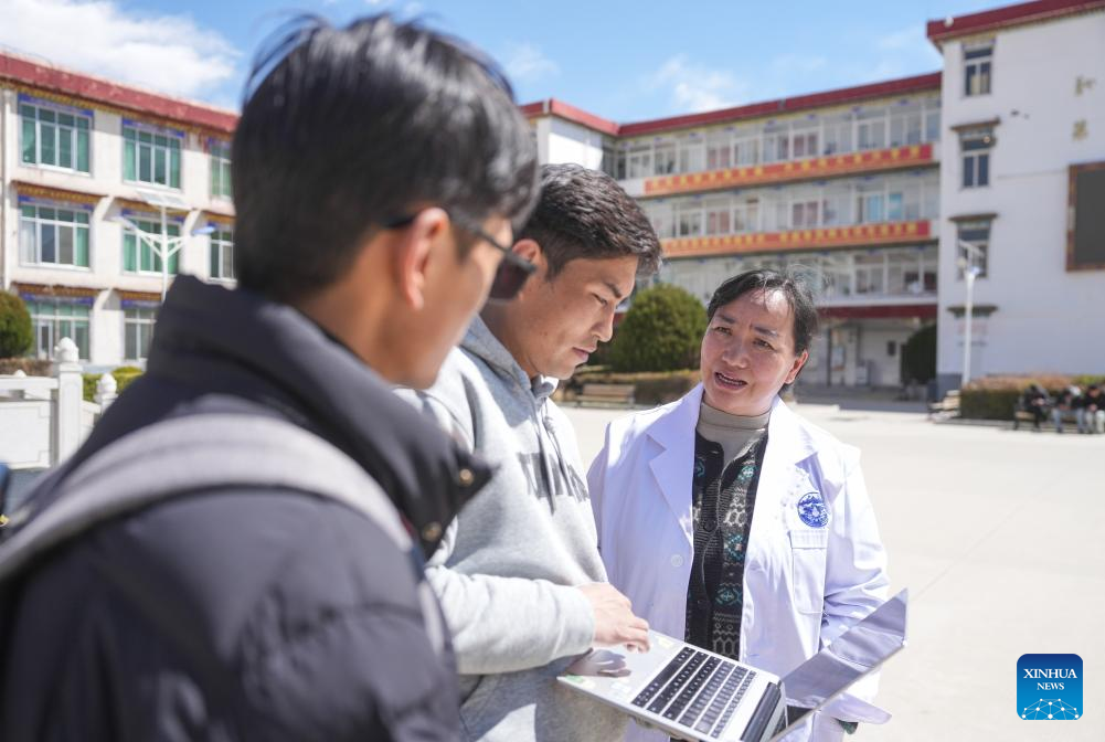 Mikyi Tsomo (L) examines a patient at the University of Tibetan Medicine in Lhasa, southwest China's Xizang Autonomous Region, March 21, 2025. (Xinhua/Jigme Dorje)