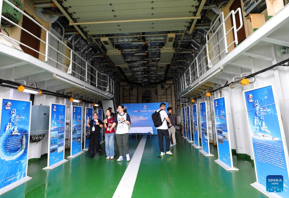 Tourists visit a ship during an open day event at a port in east China's Shanghai, July 11, 2025. July 11 marks the Maritime Day of China. (Xinhua/Fang Zhe)
