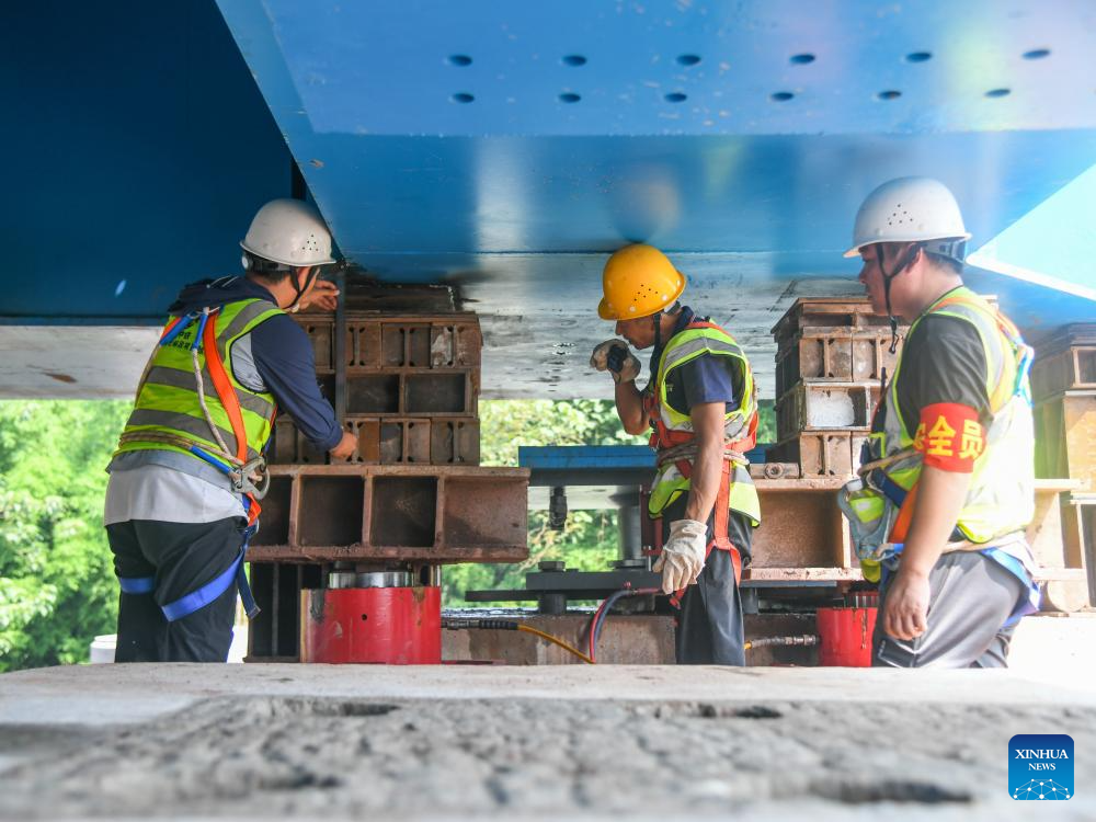Workers work at the incremental launching construction site of a bridge of the Xi'an-Chongqing high-speed railway over an expressway in Dazhou, southwest China's Sichuan Province, July 11, 2025. (Xinhua/Wang Xi)