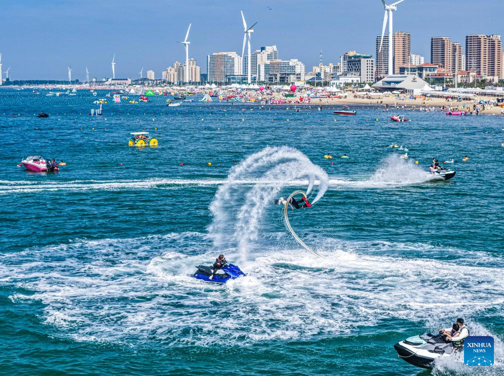 An aerial drone photo taken on July 12, 2025 shows tourists having fun at a scenic spot in Rongcheng City, east China's Shandong Province. With heatwaves hitting some Chinese provinces and regions in recent days, the scorching temperature has fueled a cooling economy boom. (Photo by Li Xinjun/Xinhua)
