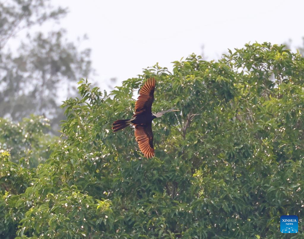 An Oriental Darter is pictured at Haiwei National Wetland Park in Changjiang Li Autonomous County, south China's Hainan Province, on July 12, 2025. An Oriental Darter (Anhinga melanogaster) has recently been observed for the first time in Hainan Province. The bird species is listed as near threatened on the IUCN Red List of Threatened Species and is extremely rare in China. (Photo by Xue Meili/Xinhua)