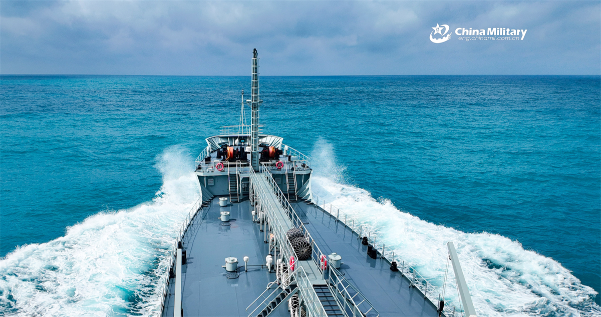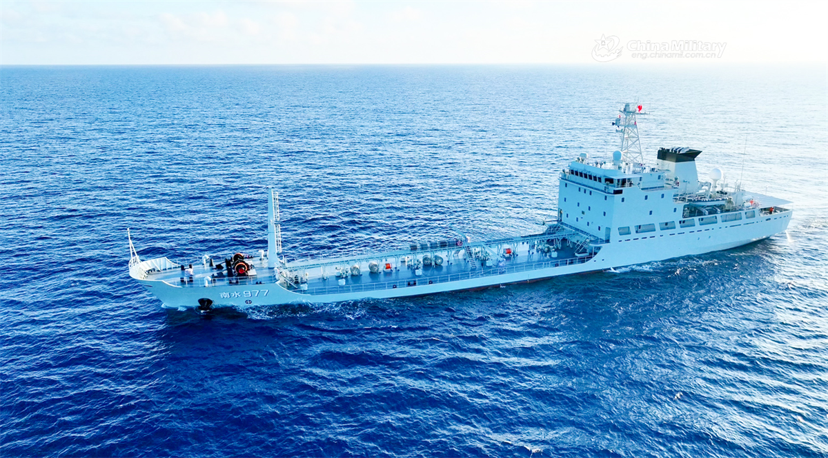 Water tanker Nanshui 977 attached to a naval service group under the Chinese PLA Southern Theater Command steams at sea during a training assessment in early July, 2025. (eng.chinamil.com.cn/Photo by Wu Huanqing)