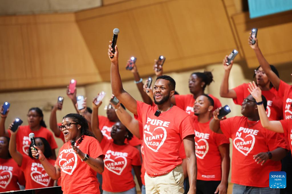 Choir members from a Chinese middle school perform in Beijing, capital of China, July 14, 2025. Bond with Kuliang: 2025 China-U.S. Youth Choir Festival, with the theme of "Singing for Peace" is held in Beijing and Fuzhou from July 9 to 18.