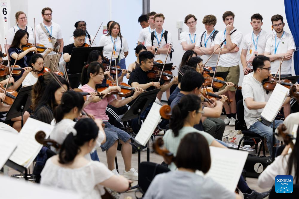 Choir members from China and the United States watch an orchestra rehearsal in Beijing, capital of China, July 14, 2025. Bond with Kuliang: 2025 China-U.S. Youth Choir Festival, with the theme of "Singing for Peace" is held in Beijing and Fuzhou from July 9 to 18.
