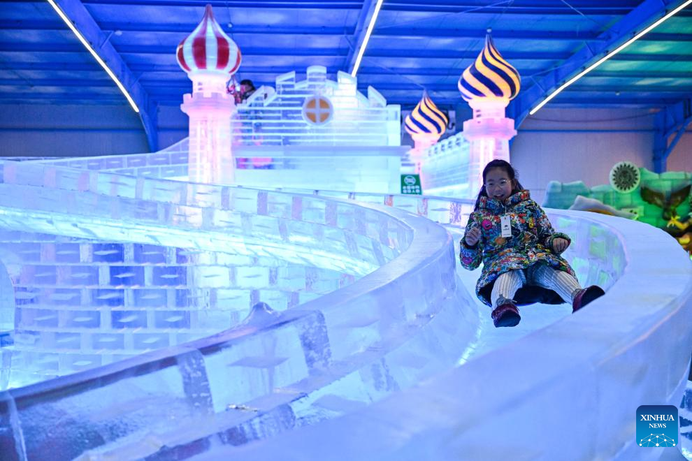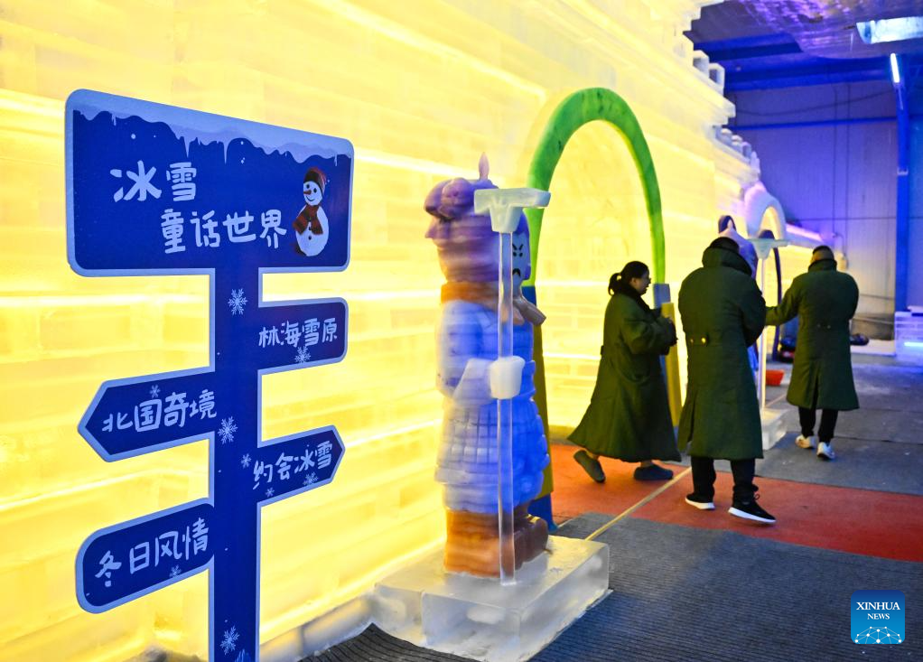 People visit an indoor snow and ice world in Huaian, east China's Jiangsu Province, July 15, 2025. An indoor snow and ice world, established at Jinhu water forest scenic spot in Huaian, provides tourists with a refreshing experience in summer. (Xinhua/Ji Chunpeng)