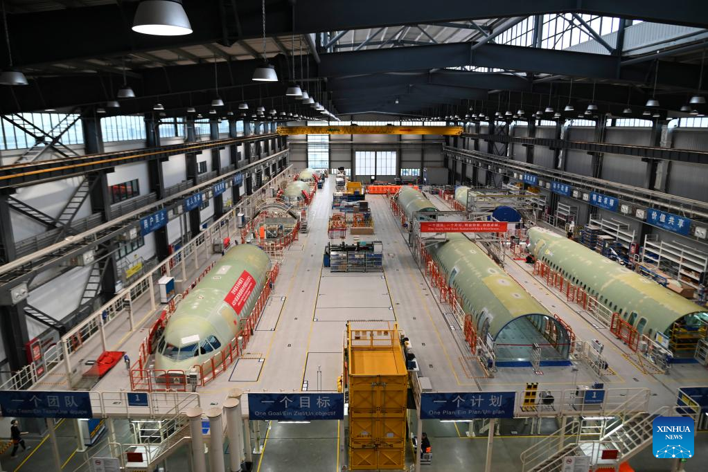This photo taken on July 15, 2025 shows the site of the fuselage equipping program of the Airbus and the Aviation Industry Corporation of China Xi'an Aircraft International (Tianjin) Corporation (AVIC XAT) in Tianjin, north China. Airbus and the Aviation Industry Corporation of China Xi'an Aircraft International (Tianjin) Corporation (AVIC XAT), officially launched the first A321 aircraft fuselage equipping cooperative project in China on Tuesday. (Xinhua)