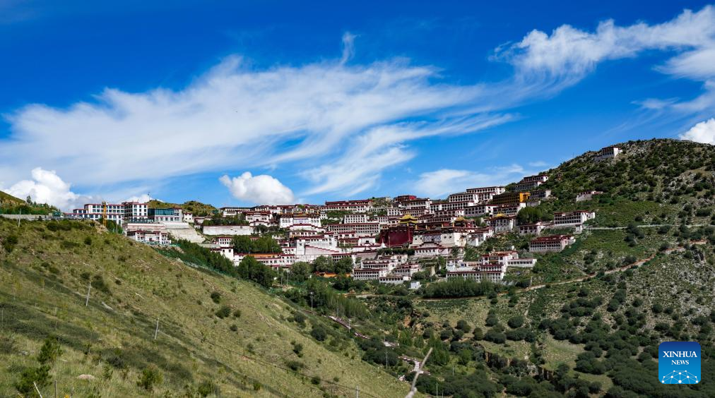 This photo taken on July 15, 2025 shows a view of the Ganden Monastery, where a preliminary examination for the Geshe Lharampa is held, in Lhasa, capital of southwest China's Xizang Autonomous Region, July 15, 2025. A total of 13 monks from multiple monasteries are in the process of completing a preliminary examination for the Geshe Lharampa, the highest academic degree in the exoteric teachings of the Gelug school of Tibetan Buddhism. Geshe Lharampa, which means "intellectual" in the Tibetan language, is the equivalent of a doctoral degree in modern education. (Xinhua/Jigme Dorje)