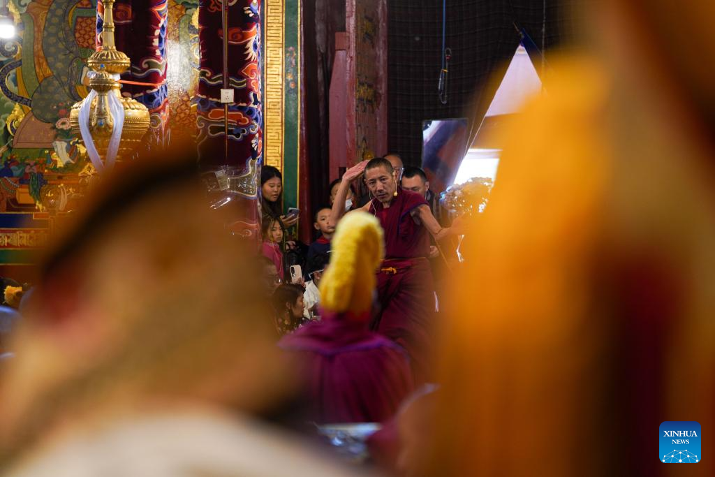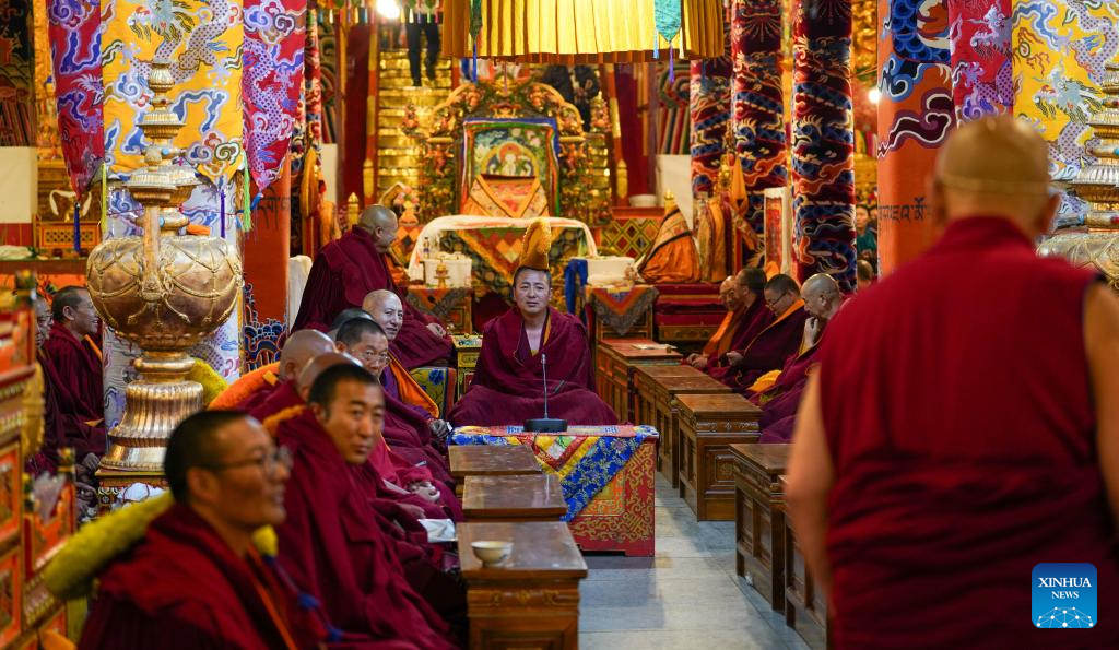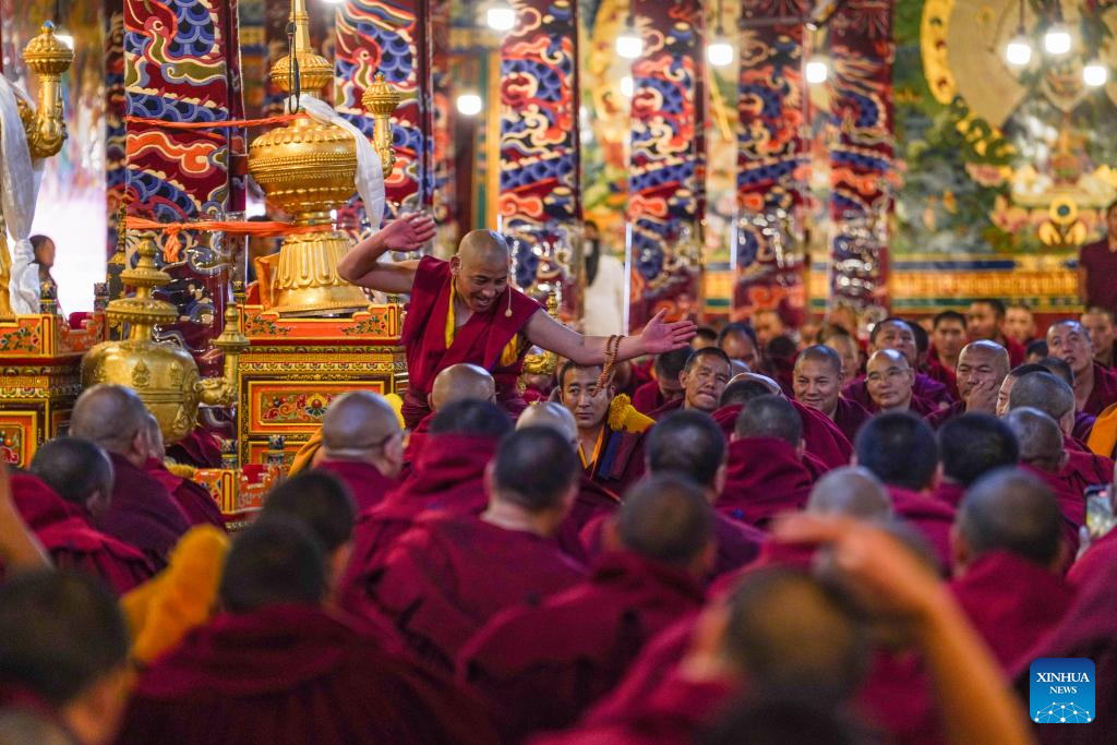 A preliminary examination for the Geshe Lharampa is held at the Ganden Monastery in Lhasa, capital of southwest China's Xizang Autonomous Region, July 15, 2025. A total of 13 monks from multiple monasteries are in the process of completing a preliminary examination for the Geshe Lharampa, the highest academic degree in the exoteric teachings of the Gelug school of Tibetan Buddhism. Geshe Lharampa, which means "intellectual" in the Tibetan language, is the equivalent of a doctoral degree in modern education. (Xinhua/Jigme Dorje)