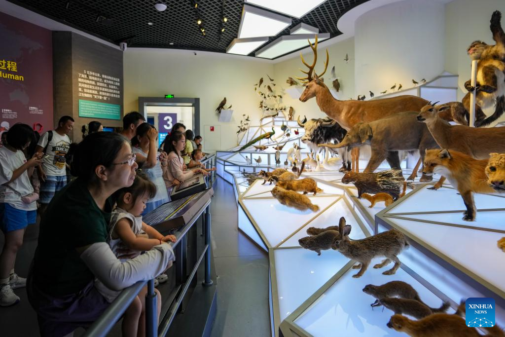 Visitors view animal specimens at the world natural heritage museum of the Chengjiang Fossil site in Chengjiang County, southwest China's Yunnan Province on July 15, 2025.