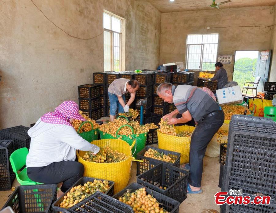 Villagers pack freshly harvested wampee fruits into boxes in Nanning, Guangxi, July 15, 2025. (Photo: China News Service/Jiang Lili)