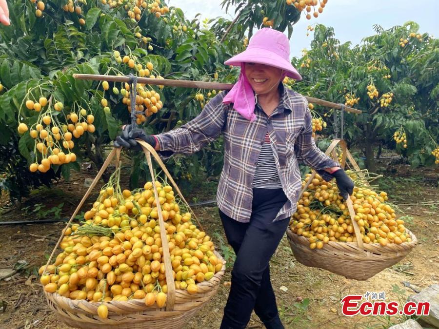 A farmer carries baskets of wampee fruits during harvest in Shuangding Town, Nanning, south China's Guangxi Zhuang Autonomous Region, July 15, 2025.(Photo: China News Service/Jiang Lili)