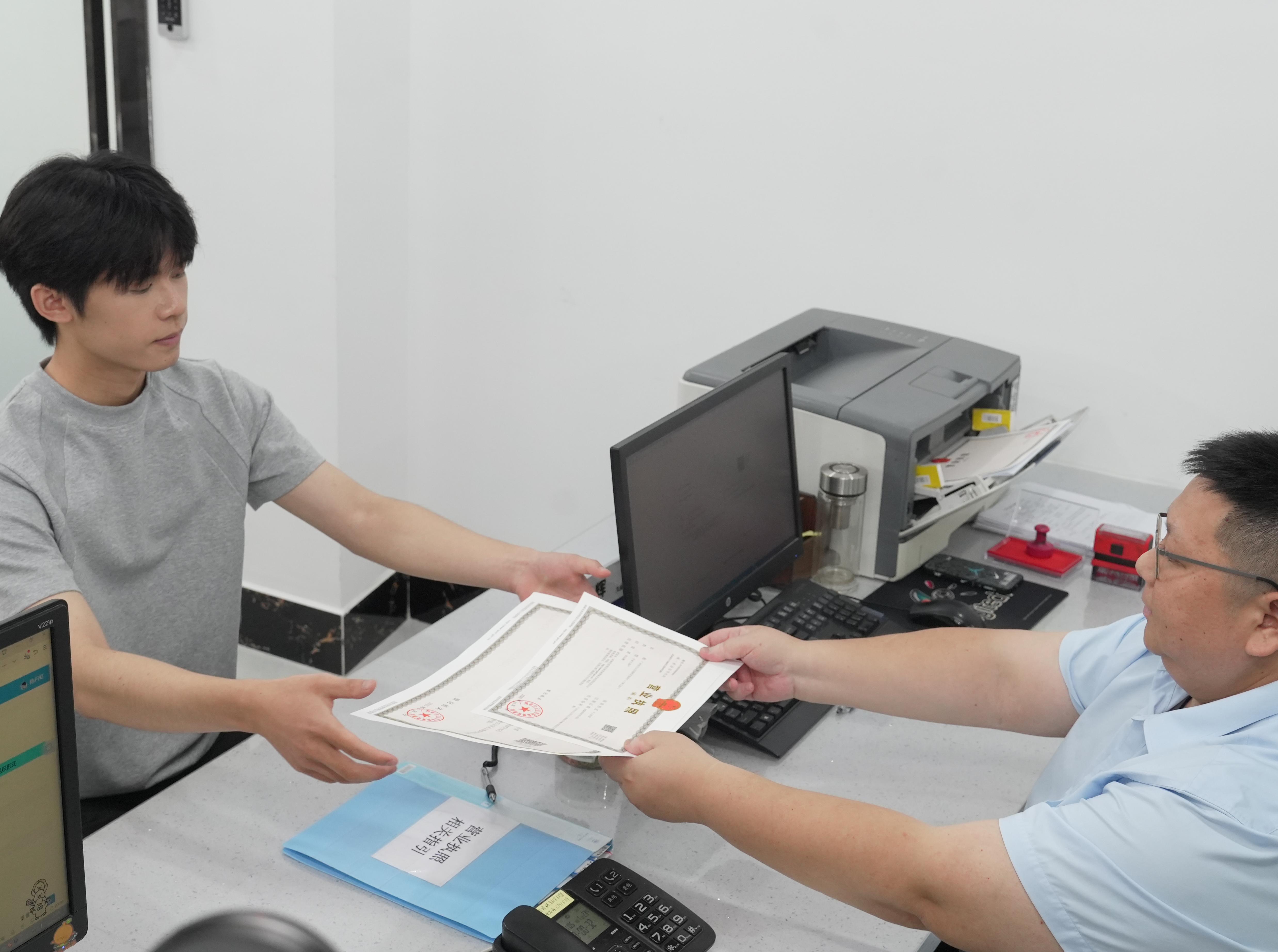 A man receives his business license issued with the help of an "AI assistant", the first of its kind in Guangzhou, south China's Guangdong Province, on July 15, 2025. (Photo/Science and Technology Daily)