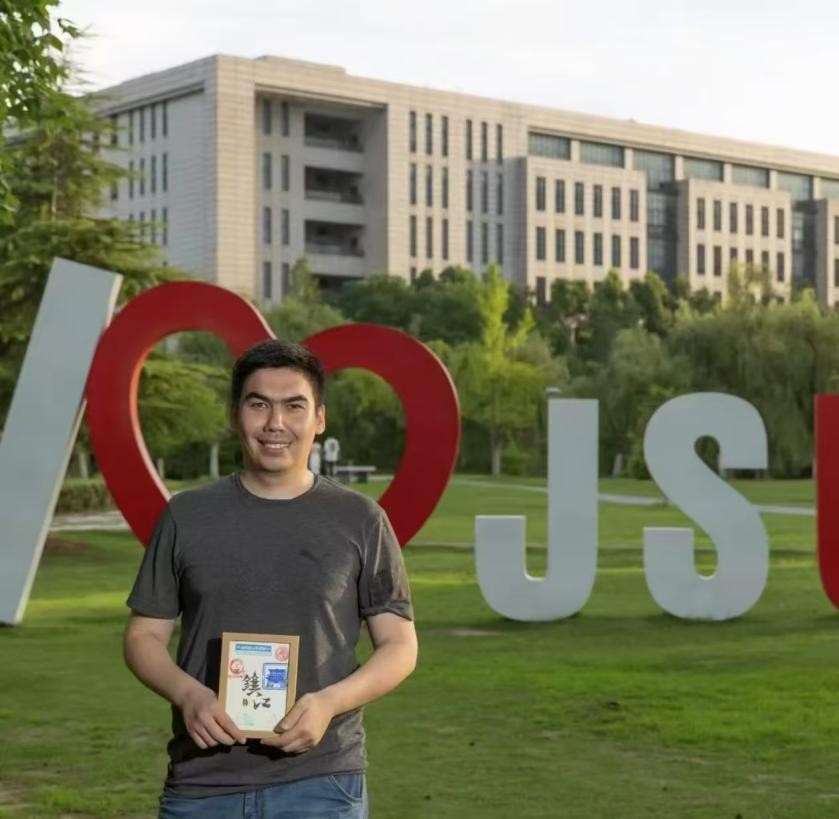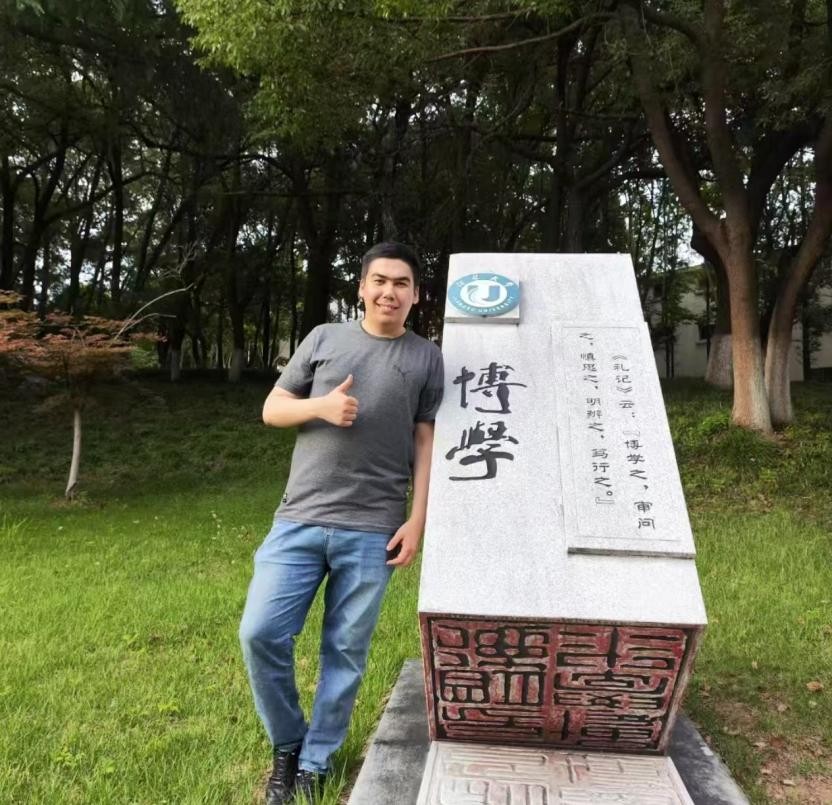 Abdulkhakimov Jaloluddin, a master's student from Uzbekistan, stands on the campus of Jiangsu University, fulfilling a three-generation dream of friendship with China that began with his grandfather during World War II. (Photo provide by Abdulkhakimov Jaloluddin)