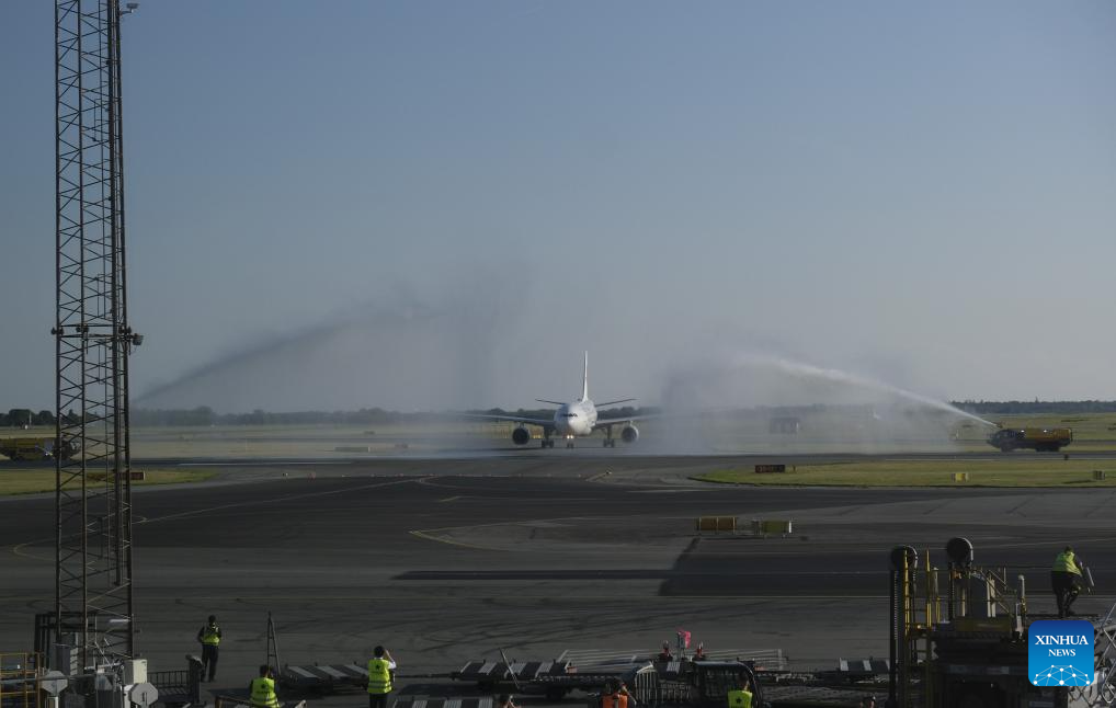 An Airbus A330 aircraft landed at Copenhagen Airport at 7 p.m. local time, where it was greeted with a traditional water salute. After two hours, the return flight departed Copenhagen, carrying over 250 passengers back to Shanghai.