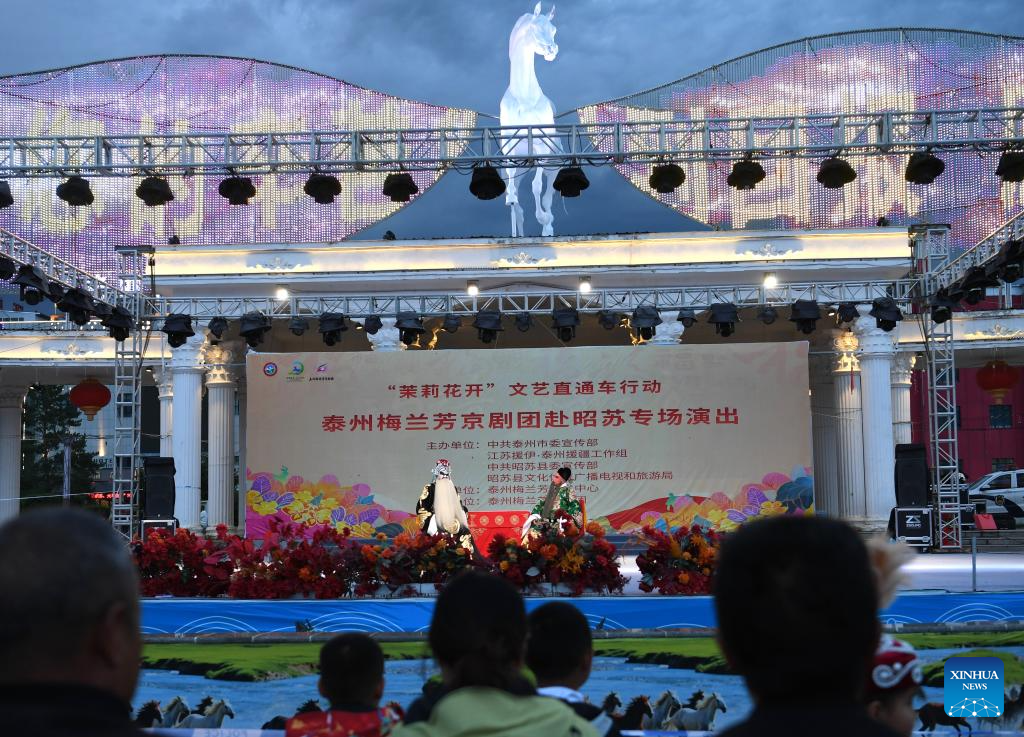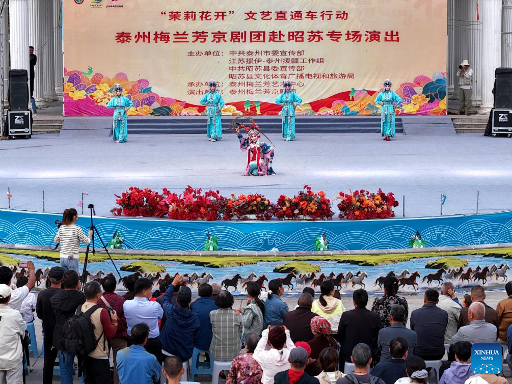 Artists of Taizhou Mei Lanfang Peking Opera Troupe perform a highlight from classic Peking Opera play Hujiazhuang (Manor of the Hu's) in Zhaosu County of Ili Kazak Autonomous Prefecture, northwest China's Xinjiang Uygur Autonomous Region, July 17, 2025. Taizhou Mei Lanfang Peking Opera Troupe from Taizhou in east China's Jiangsu Province presented a special staging of highlights from classic Peking Opera plays such as "Hujiazhuang" (Manor of the Hu's) and "Jiangxianghe" (General and Premier Make Up) here on Thursday. The event is part of Taizhou's cultural exchange program to promote cultural development in Xinjiang and to strengthen ties between Taizhou and Zhaosu. (Xinhua/Xie Xiudong)