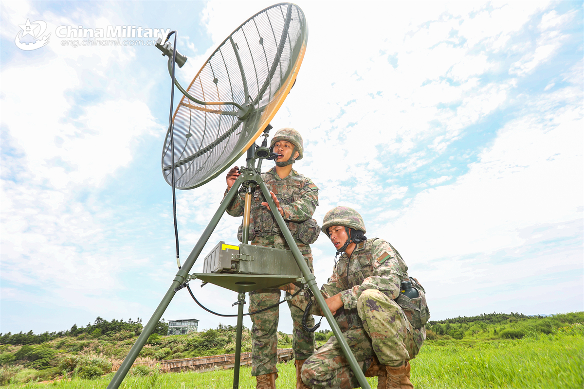 Soldiers assigned to an artillery detachment of a brigade under the Chinese PLA 72nd Group Army set up antenna system during a live-fire shooting training exercise in late June, 2025. (eng.chinamil.com.cn/Photo by Zhang Naiyou and He Fei)