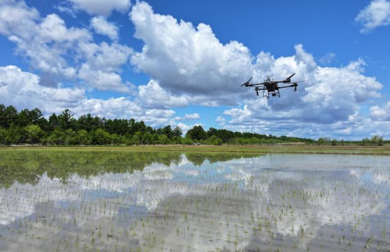 A crop protection drone applies fertilizer over a paddy rice field of a farming company under the Beidahuang Group's branch in northeast China's Heilongjiang Province, May 21, 2025. (Photo by Li Xing/Xinhua)