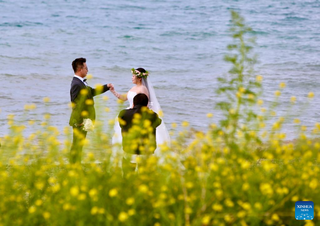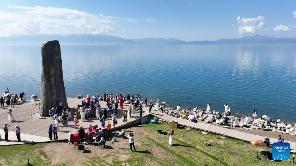 A couple pose for photos by the Sayram Lake in Bortala Mongolian Autonomous Prefecture, northwest China's Xinjiang Uygur Autonomous Region, July 16, 2025. Nestled in the Tianshan Mountains, Sayram Lake, Xinjiang's highest and largest alpine lake, has entered its peak tourist season in midsummer. (Xinhua/Geng Xinning)